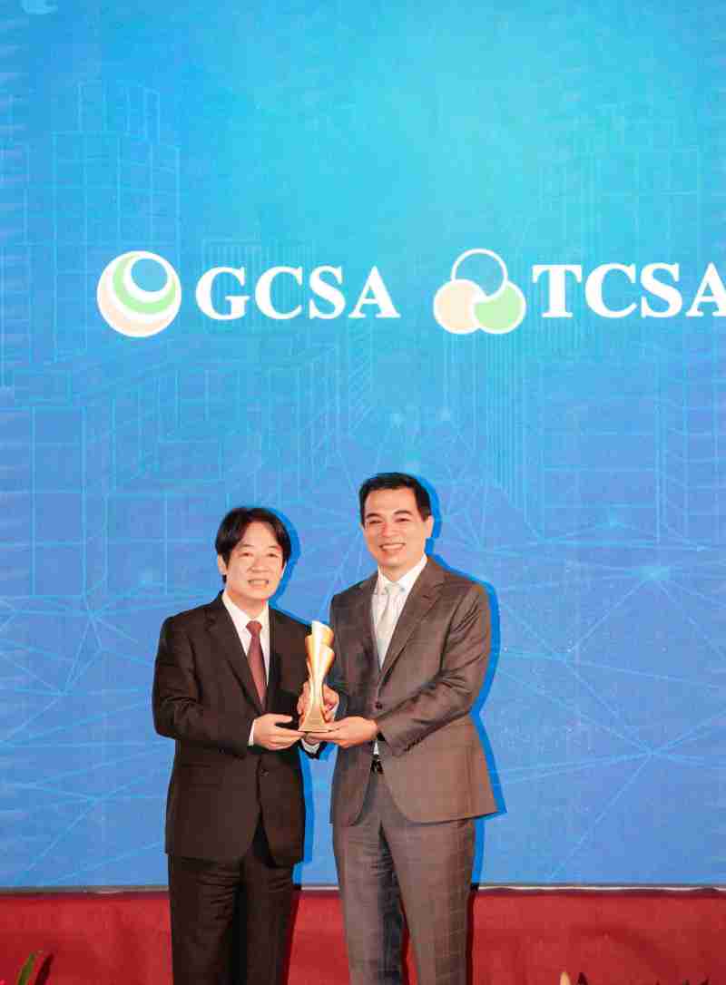 达全方位永续表现获全球永续奖及台湾永续奖肯定,,,,由副总统赖清德颁奖 (左),,,,尊龙集团总经理柯富仁 (右) 代表领奖