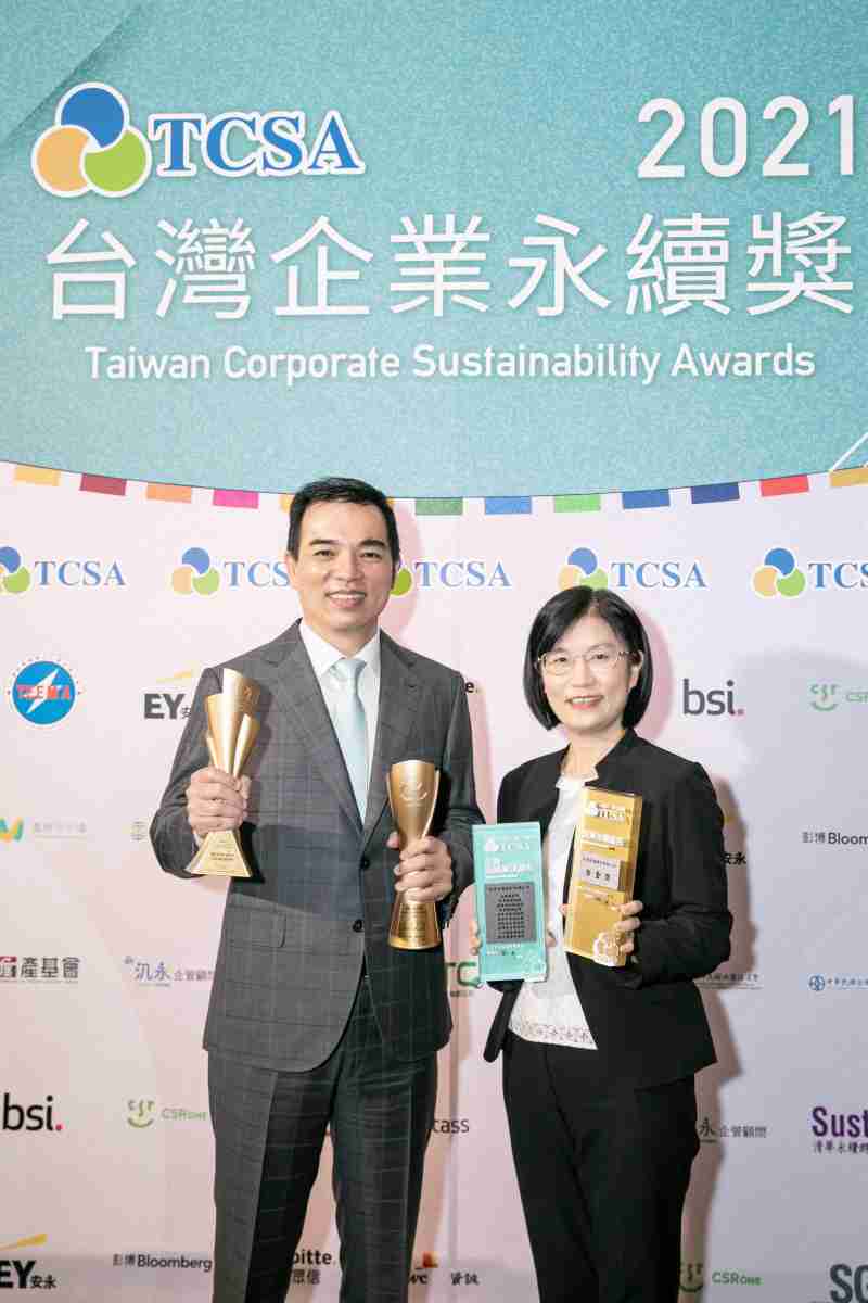 达在台湾永续奖所评比环境、、、、社会、、治理等各面向的永续绩效均获高度肯定 (左:尊龙集团光电总经理暨营运长柯富仁,,右:尊龙集团光电永续长古秀华)