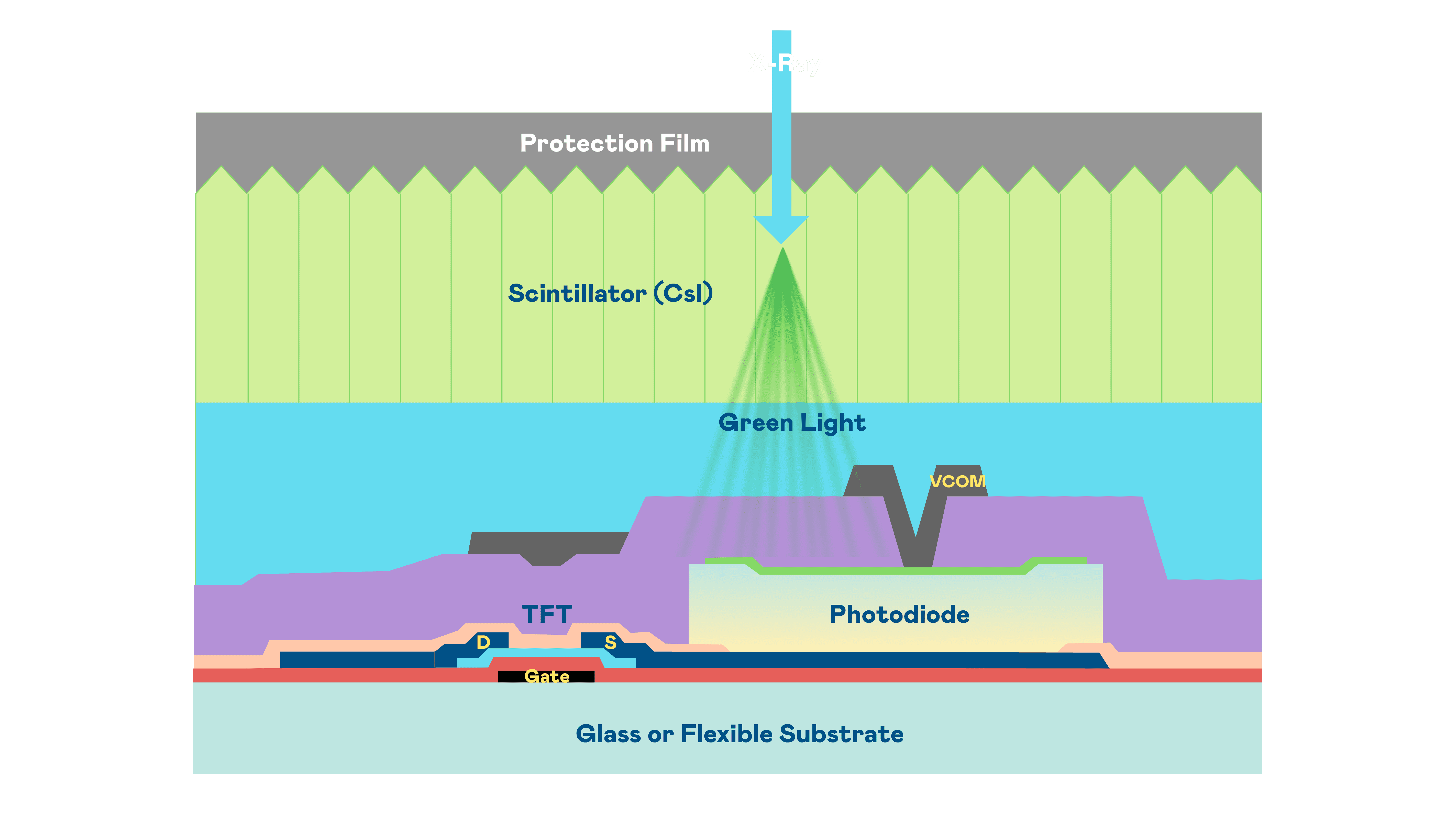 尊龙集团的X光影像感测阵列使用薄膜电晶体 (TFT) 作为每个像素的读取开关,,,搭配光电二极体(Photodiode)的光电转换元件,,用以感测X光影像讯号。。。